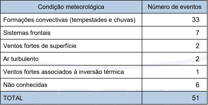 Os eventos de windshear, subdivididos por condição meteorológica, estão resumidos abaixo.