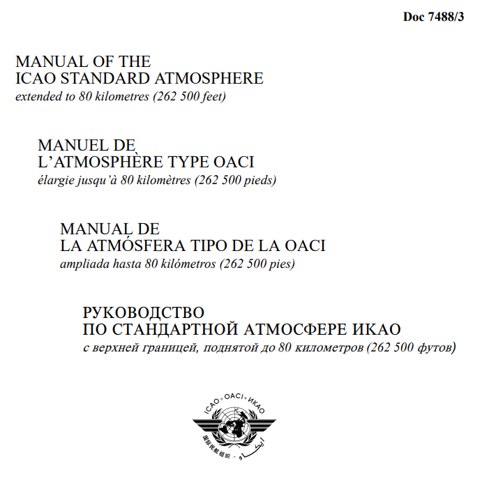 - Doc 7488 — Manual of the ICAO Standard Atmosphere (extended to 80 kilometres (262 500 feet).