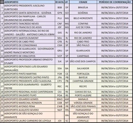 A redefinição da malha de voos regulares no período do Mundial foi necessária para atender a demanda específica para o evento. Por essa razão, a ANAC está coordenando a distribuição de slots em 25 aeroportos, dos quais 12 nas cidades-sede e outros 13 localizados até 200 quilômetros de distância dessas cidades. A coordenação desses 25 aeroportos vai variar de acordo com a data de realização dos jogos em todas as fases da Copa. Consulte abaixo o período de coordenação dos 25 aeroportos.