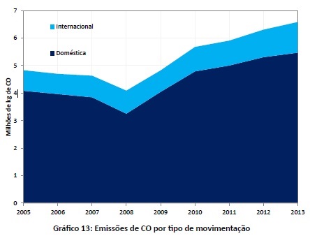 Dentre os resultados observados está a emissão do monóxido de carbono (CO). Enquanto o número de movimentos da aviação civil brasileira cresceu 75% em nove anos, o crescimento de emissões do gás passou de cinco mil toneladas em 2005 para cerca de 6,6 mil em 2013, com um crescimento de 32%. Segundo a Superintendência de Relações Internacionais da ANAC, a modernização da frota brasileira é um dos motivos para o número de emissões estarem abaixo do crescimento do setor.