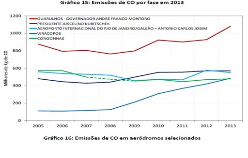 Com o novo relatório é possível quantificar essas emissões desagregadas por aeroporto. Dentre os cinco maiores aeroportos do país Guarulhos (SP) é o maior emissor de CO, por consequência de ser também líder no número de voos. Por outro lado, apesar de Congonhas (SP) possuir a segunda maior movimentação, aeroportos como Presidente Juscelino Kubitschek (DF) e Galeão (RJ) emitiram mais monóxido de carbono nos últimos anos, o que é explicado pelo tempo médio de taxi nestes aeroportos.