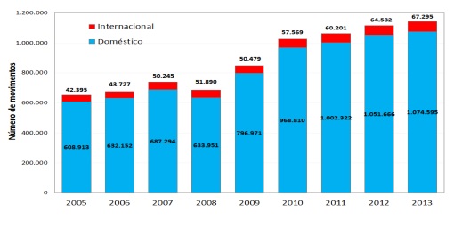 O relatório apresenta dados relativos à emissão de poluentes atmosféricos, que são os gases responsáveis por impactos negativos na saúde humana, como CO, NOx, SO2, COV e Material Particulado. Há também informações sobre a emissão de gases de efeito estufa direto, como CO2, CH4 e N2O. Para a base de dados foram analisados mais 1,5 milhões de movimentos de aeronaves a cada ano. O Inventário de Emissões revela que, entre os anos de 2005 a 2013, o número de movimentos de aeronaves quase duplicou. Veja no gráfico abaixo: