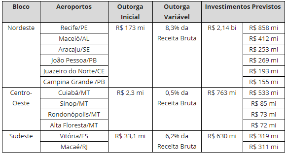 NOVOS VALORES – Os três blocos tiveram reajustes tanto nos investimentos previstos, que aumentaram, quanto nas outorgas fixas iniciais e nos percentuais da parcela da outorga variável, que reduziram cerca de 50% ou mais. O Centro-Oeste teve a maior variação, passando de R$ 10,4 milhões para R$ 2,3 milhões o lance mínimo do leilão. Já a parcela variável reduziu de 2,1% para 0,5% da receita bruta da concessionária. Assim como na rodada anterior, não há participação da Infraero.