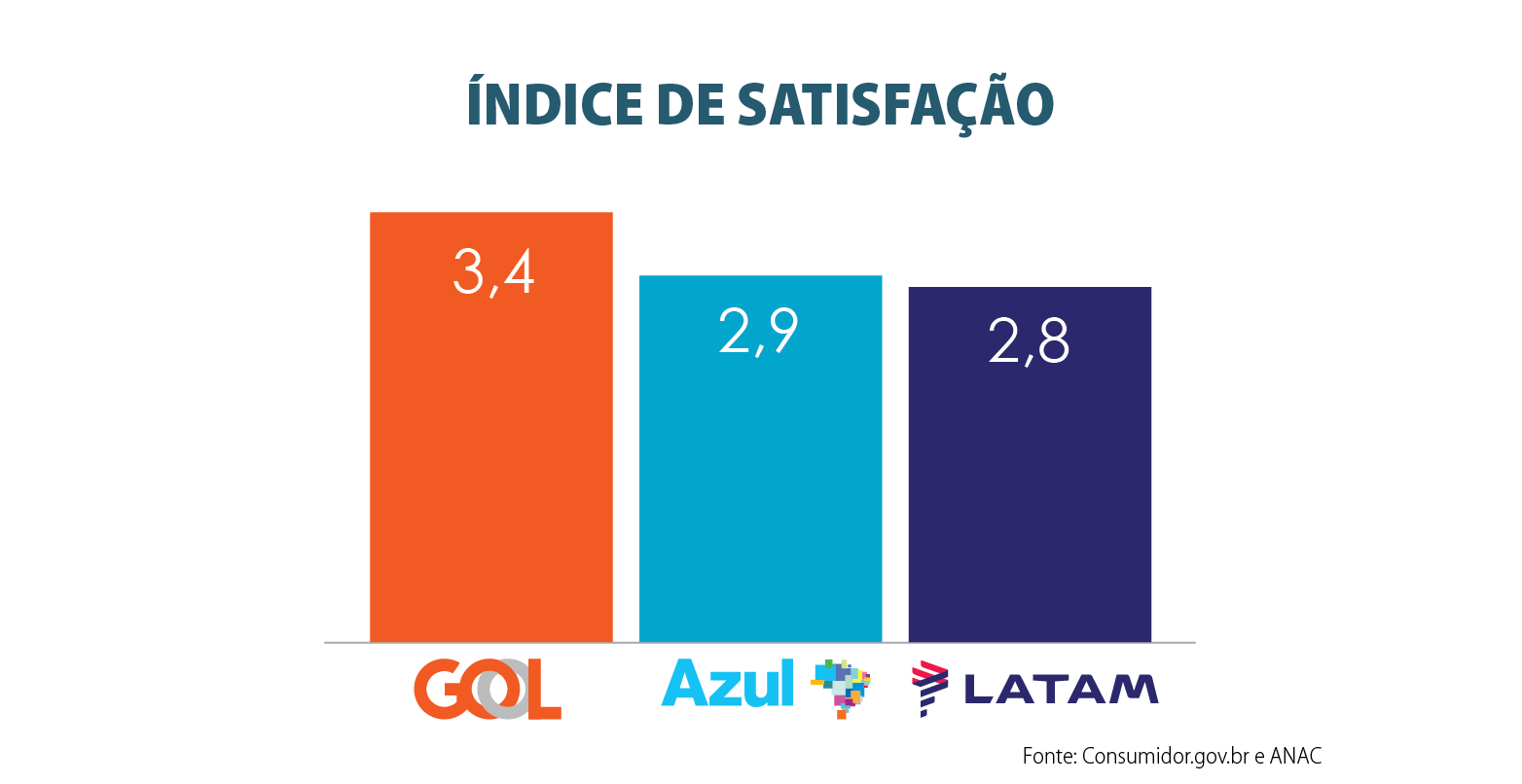 Das companhias brasileiras que mais transportaram passageiros nos três primeiros meses do ano, a Gol apresentou o melhor resultado no período, com média de 3,4. Azul e Latam tiveram resultados similares no período, com 2,9 e 2,8, respectivamente. Das estrangeiras com maior número de passageiros transportados, a American Airlines teve o melhor desempenho, com índice de satisfação de 2,8.