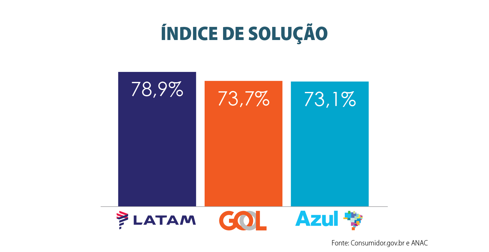 Das companhias aéreas brasileiras que mais transportaram passageiros no trimestre, a Latam apresentou o maior índice de solução, com 78,9%. A Gol, com percentual de 73,7, e a Azul, com 73,1%, vieram em seguida. Em relação às empresas estrangeiras, considerando aquelas com o maior de volume de passageiros pagos transportados, a American Airlines apresentou o melhor indicador, da ordem de 70,7%.