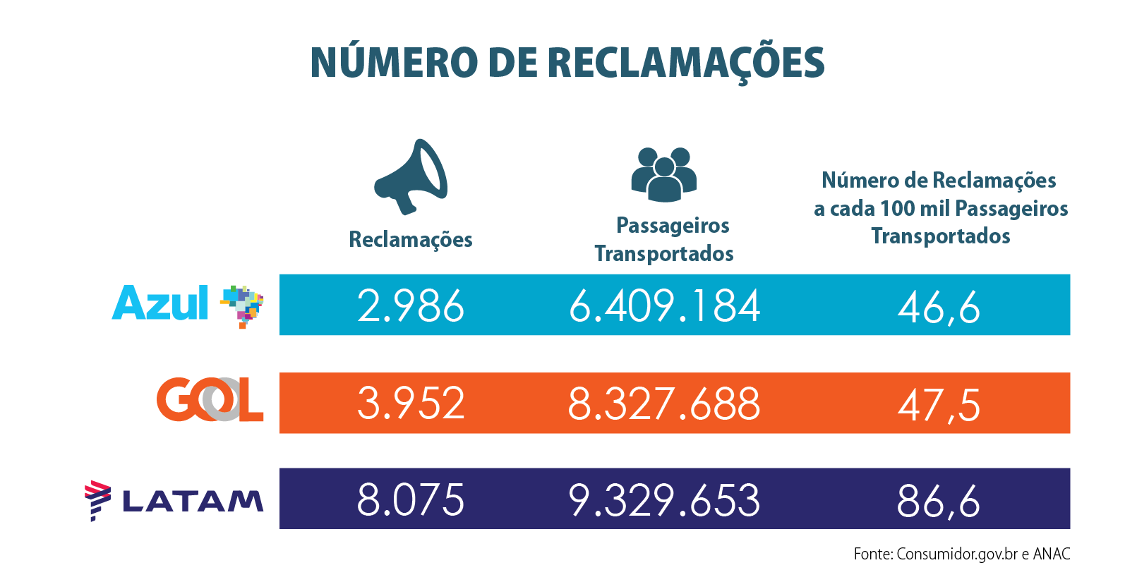 No primeiro trimestre deste ano, entre as três companhias aéreas brasileiras que mais transportaram passageiros, a Azul apresentou o menor número de reclamações para cada grupo de 100 mil passageiros pagos transportados no período, de 46,6. Em seguida, aparecem Gol e Latam, com 47,5 e 86,6, respectivamente.