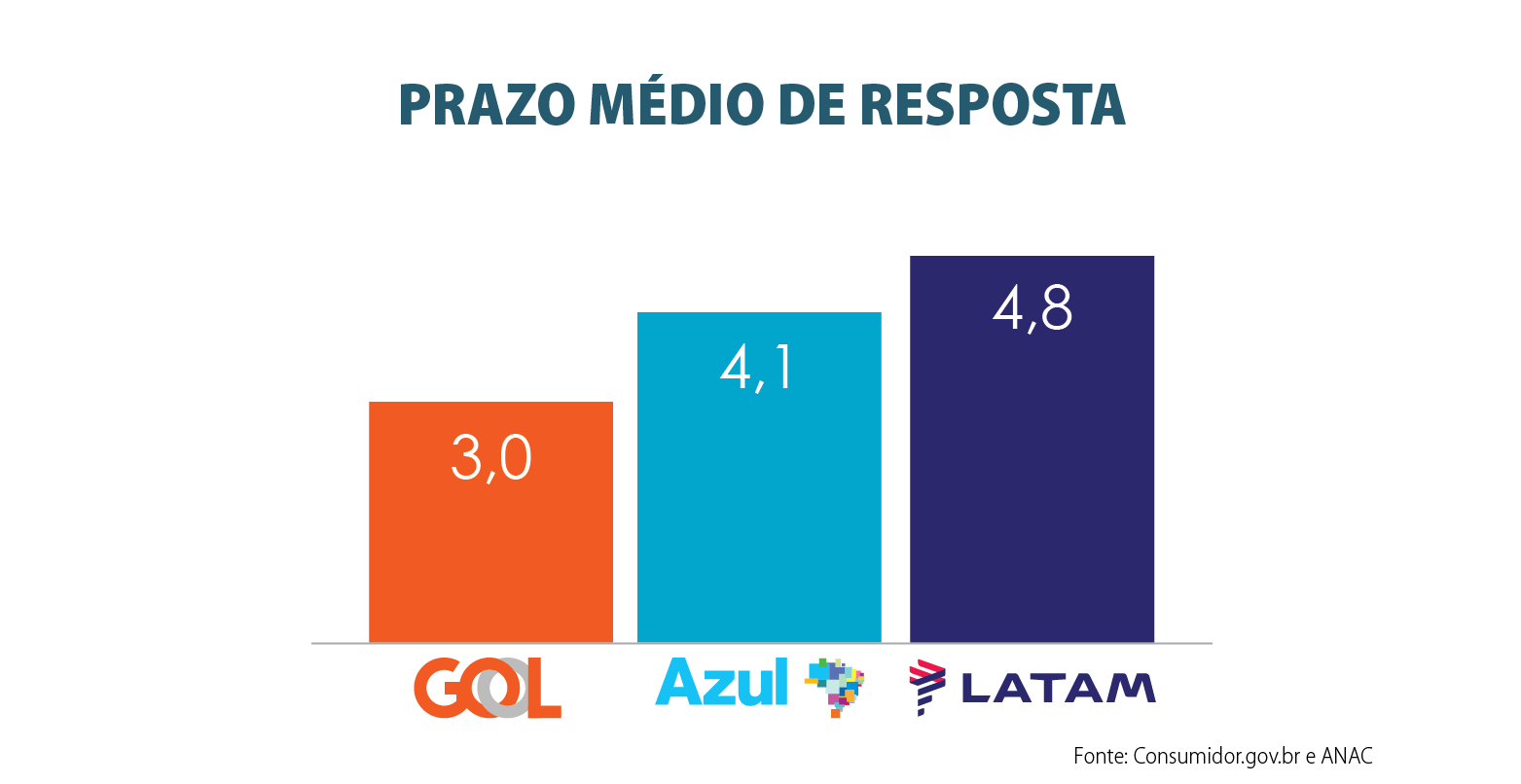 Das companhias aéreas brasileiras que mais transportaram passageiros no trimestre, a Gol apresentou o melhor tempo médio de resposta, de 3 dias. Em seguida, vieram a Azul, com 4,1, e a Latam com 4,8. Em relação às empresas estrangeiras, a TAP apresentou o melhor tempo médio de resposta, de 3,2 dias.