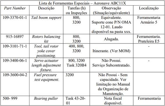 Um exemplo de conteúdo aceitável para a listagem das ferramentas (incluindo as especiais) deve conter, no mínimo: seu Part Number (P/N); sua descrição (normalmente seu nome); tarefas de manutenção que a requerem no manual do fabricante, se necessário; uma observação quanto à posse da ferramenta e sua equivalência, caso aplicável, e a localização física desta na forma de controle da empresa: