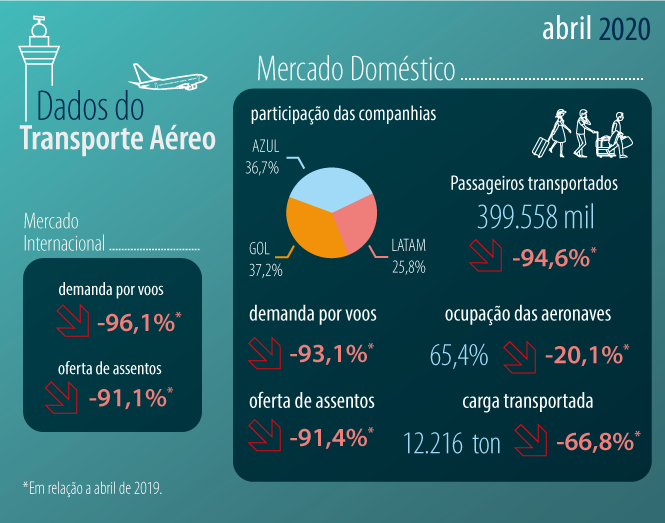 Devido à pandemia do Coronavírus, a demanda doméstica, medida em passageiros quilômetros pagos (RPK), por voos no mercado doméstico teve redução de 93,1% em abril deste ano, na comparação com abril de 2019. A redução da demanda era esperada em virtude da implementação da Malha Aérea Essencial que reduziu em 91,6% a oferta de voos no país.