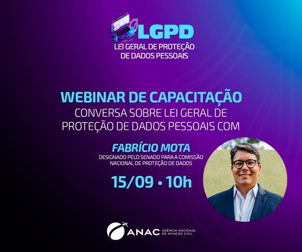 Com o objetivo de compartilhar informações sobre a Lei Geral de Proteção de Dados Pessoais (LGPD), a Agência Nacional de Aviação Civil (ANAC) irá promover no dia 15 de setembro, a partir das 10h, o webinar “Conversa sobre a Lei Geral de Proteção de Dados Pessoais”. O normativo tem como fundamento resguardar o respeito à privacidade, à intimidade, à honra e à imagem das pessoas em suas relações com organismos públicos e privados. O evento é gratuito e será transmitido ao vivo no canal oficial da ANAC no YouTube (clique no link para acessar).