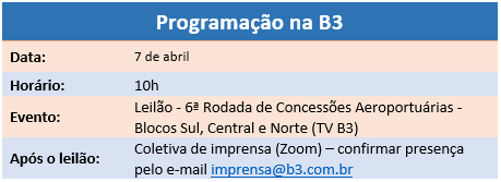 Os jornalistas interessados em participar da coletiva de imprensa que será realizada ao término do leilão devem confirmar presença pelo e-mail imprensa@b3.com.br para receberem os dados de acesso. A coletiva será pela plataforma Zoom. A sessão pública do leilão poderá ser acompanhada pela TV B3 sem a necessidade de senha de acesso.