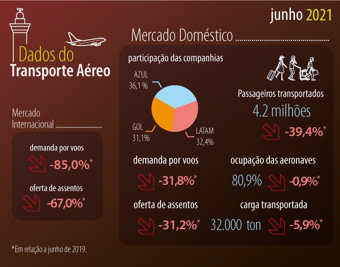 Em junho de 2021, foram transportados cerca de 4,2 milhões de passageiros no mercado doméstico, número 39% menor do que o registrado em 2019.