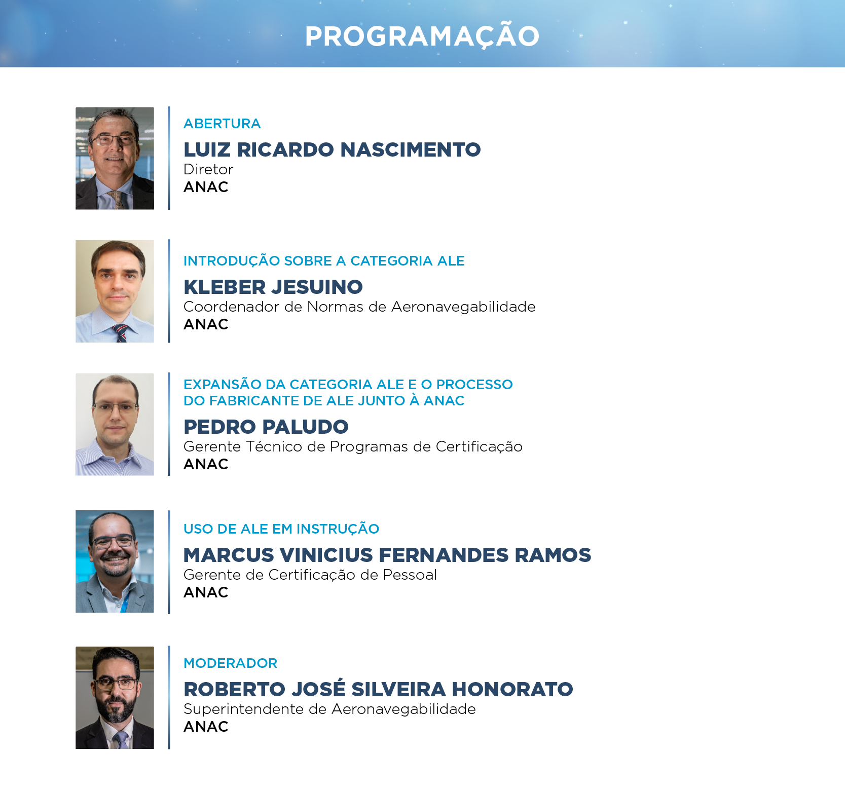 Além de apresentar e discutir essas alterações, o webinário tra z na programação um espaço para esclarecer o uso de ALE para instrução de pilotos e também para responder perguntas dos participantes enviadas durante a programação. O webinário terá participação livre e transmissão online pelo canal oficial da ANAC no YouTube a partir das 14h (clique no link para agendar um lembrete do início do evento). Dúvidas podem ser enviadas para os palestrantes por meio da plataforma de comunicação Sli .do (clique no link para acessar). A abertura será realizada pelo diretor da ANAC, Luiz Ricardo Nascimento. Os painéis serão moderados pelo s uperintendente de a eronavegabilidade , Roberto José Silveira Honorato .