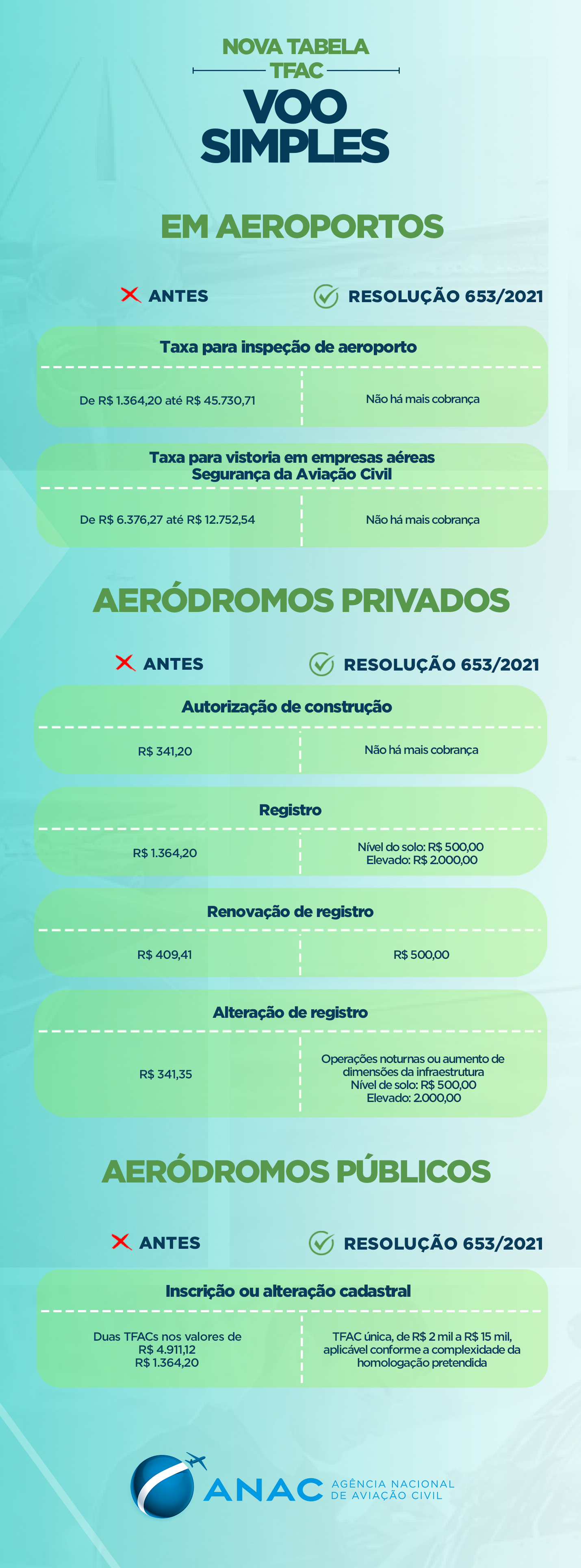Com o intuito de restringir a cobrança da TFAC aos casos mais complexos, bem como ajustar e atualizar valores, a nova tabela revogou a taxa de R$ 341,20 para autorização de construção de aeródromo ou de heliponto privado, serviço não mais prestado pela Agência, e alterou várias outras, como a taxa para inscrição de aeródromos privados, reduzida de R$ 1.364,20 para R$ 500,00, e fixação em R$ 2.000,00 a TFAC para inscrição para heliponto, dada a complexidade do processo.