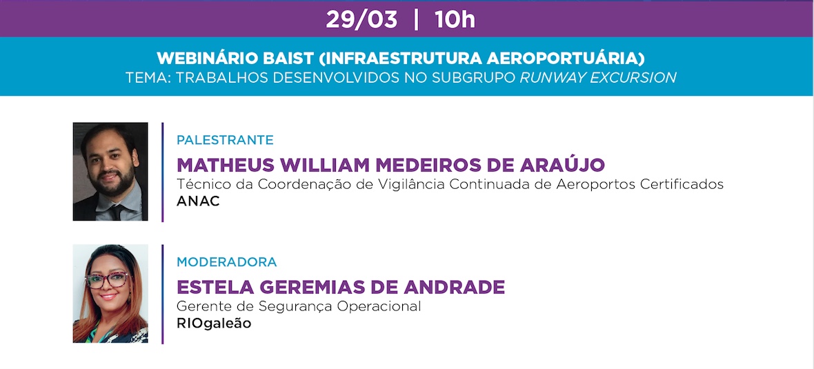 O primeiro webinário, com início às 10h, será conduzido pelo BAIST. Com o tema “Trabalhos desenvolvidos no subgrupo Runway Excursion ”, o evento conta com a palestra do técnico em regulação da ANAC, Matheus de Araújo. A conversa vai ser mediada pela presidente do grupo e gerente de segurança operacional do aeroporto RioGaleão, Estela de Andrade.