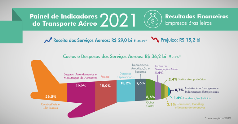 Com relação aos resultados financeiros, apesar da melhoria em relação a 2020, os números do setor ainda se encontravam inferiores em 2021 quando comparados aos resultados pré-pandemia. As companhias aéreas brasileiras tiveram receita de 29 bilhões em 2021, valor 35,6% menor em relação ao total registrado em 2019. Os custos e despesas dos serviços aéreos ultrapassaram 36 bilhões em 2021. O valor representou redução de 15% na comparação com 2019.