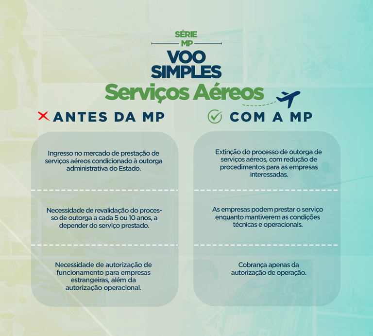 A antiga regulação definida pelo CBA fixava barreiras normativas que não eram mais compatíveis com o dinamismo do setor aéreo. Diante das circunstâncias impostas pela pandemia de covid-19, reavaliar as limitações legais que dificultavam o desenvolvimento e o retorno das atividades da aviação civil tornou-se uma urgência. Assim, uma das alterações trazidas pela MP do Voo Simples foi a eliminação do processo de outorga de serviços aéreos, que permite que a Agência concentre esforços no procedimento de certificação das empresas aéreas, com foco na segurança das operações.