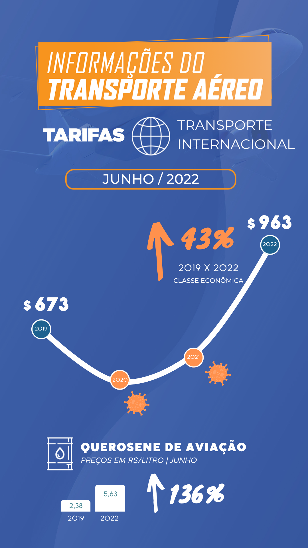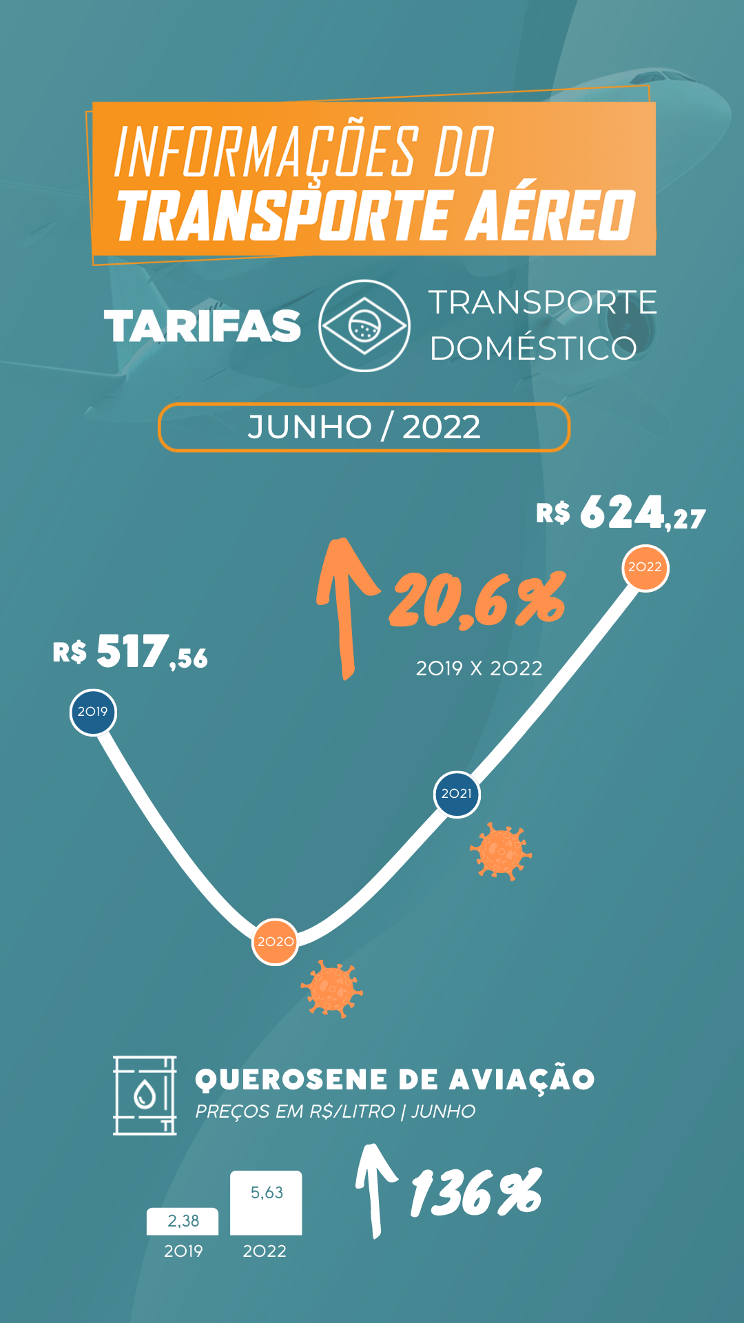 De janeiro a junho, o Querosene de Aviação (QAV), um dos principais componentes que têm afetado diretamente o preço das tarifas, acumulou alta de 52%. Nos seis primeiros meses deste ano frente ao mesmo período de 2019, na média, o QAV registrou alta de 100%. Esse item tem representado aproximadamente 35% dos custos das empresas aéreas em 2022.