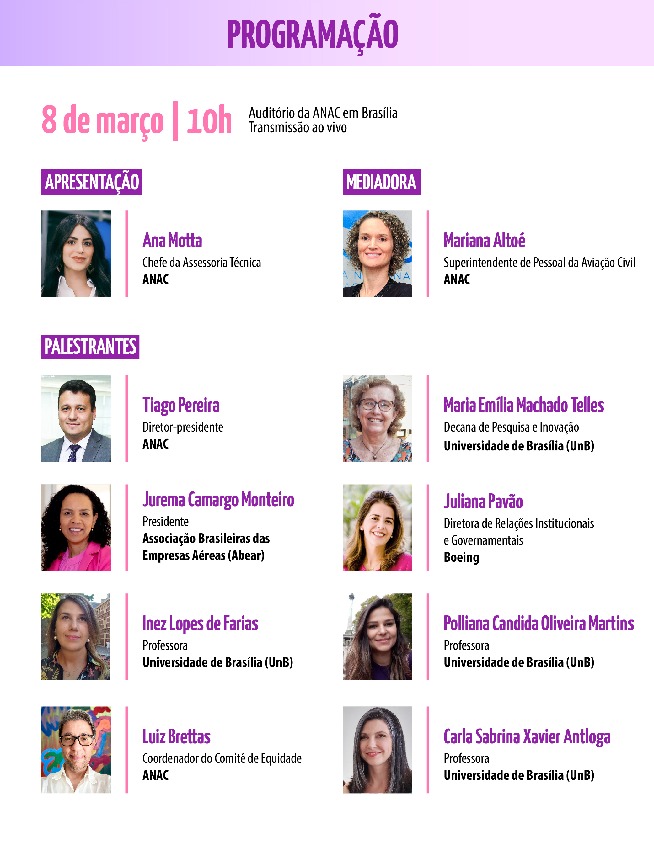Em parceria com a Universidade de Brasília (UnB) e a Associação das Mulheres Aviadoras do Brasil (AMAB), o evento trará debates sobre os principais desafios enfrentados pelas mulheres para ingressar e avançar nas carreiras do setor aéreo. Também participam do debate a Associação Brasileira das Empresas Aéreas (Abear) e a empresa Boeing.