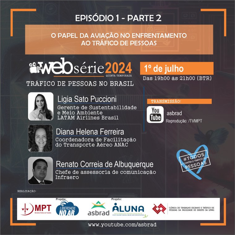 A Agência Nacional de Aviação Civil (Anac) participará do primeiro episódio da websérie sobre Tráfico de Pessoas no Brasil, que será lançado às 19h de segunda-feira, 1º de julho. A série é uma produção do projeto "Liberdade no Ar", do Ministério Público do Trabalho (MPT), dedicada à prevenção do tráfico de pessoas.