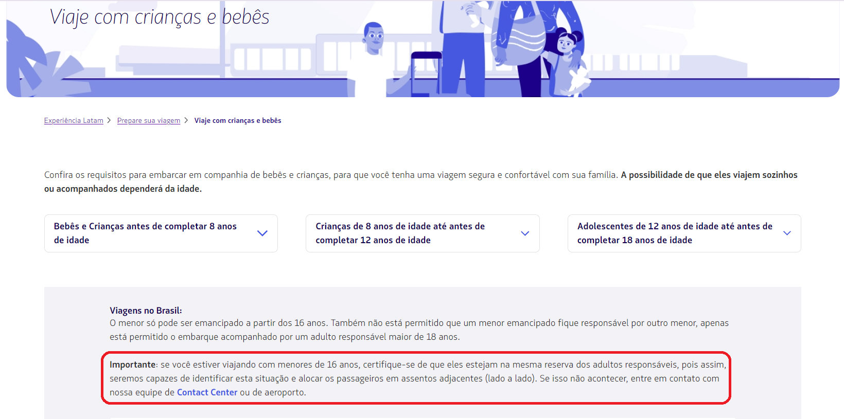 - *Em simulação de compra de bilhete de passageiro menor de 16 anos, site da Latam apresenta página destinada ao esclarecimento de direitos e requisitos para embarque de bebês, crianças e adolescentes. No destaque em vermelho a companhia aérea disponibiliza um link para contato, caso a criança não seja alocada em assento ao lado do acompanhante.