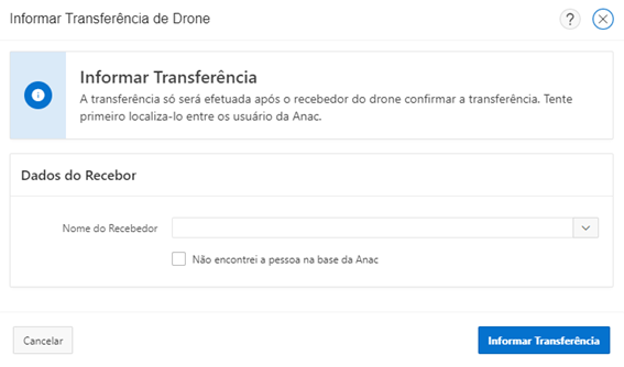 Enquanto a transferência não for confirmada pelo recebedor, o drone continuará vinculado ao usuário inicial o qual poderá visualizá-lo na aba “Drones Transferidos Esperando Confirmação do Recebedor”. Nessa aba também é possível cancelar a operação a qualquer momento desde que o recebimento não tenha sido ainda confirmado pelo outro usuário.