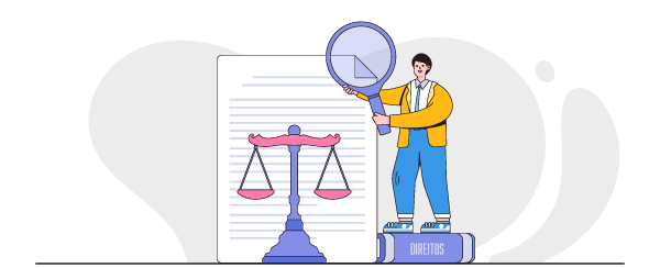 Ilustração de um homem com uma lupa analisando um documento.