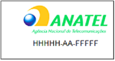 As imagens acima mostram selos de identificação de equipamento certificado pela Anatel. Nas ilustrações, H identifica a certificação do produto; A, o ano da emissão; e F, o fabricante. O selo pode ser usado também na versão monocromática (preto e branco).
