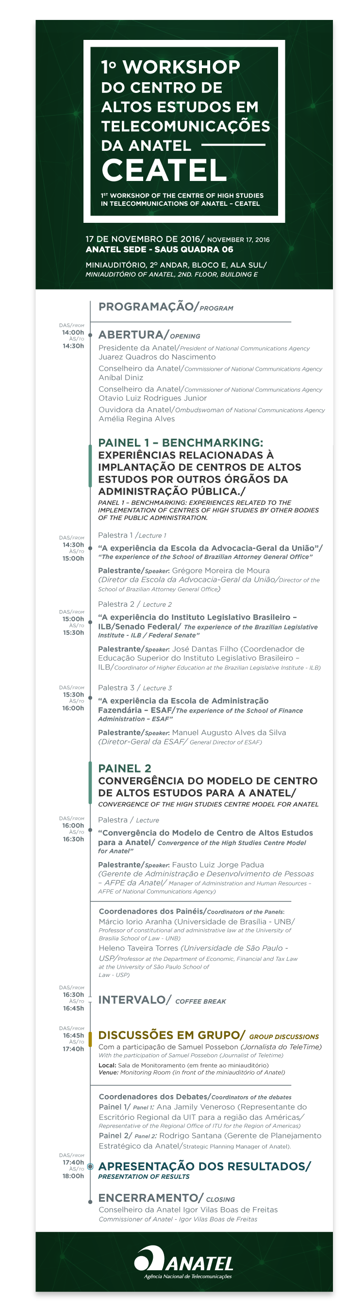 Após este, haverá, às 16h, o segundo painel, “Convergência do Modelo de Centro de Altos Estudos para a Anatel”, que terá como palestrante o gerente de Administração e Desenvolvimento de Pessoas da Agência, Fausto Luiz Jorge Padua.