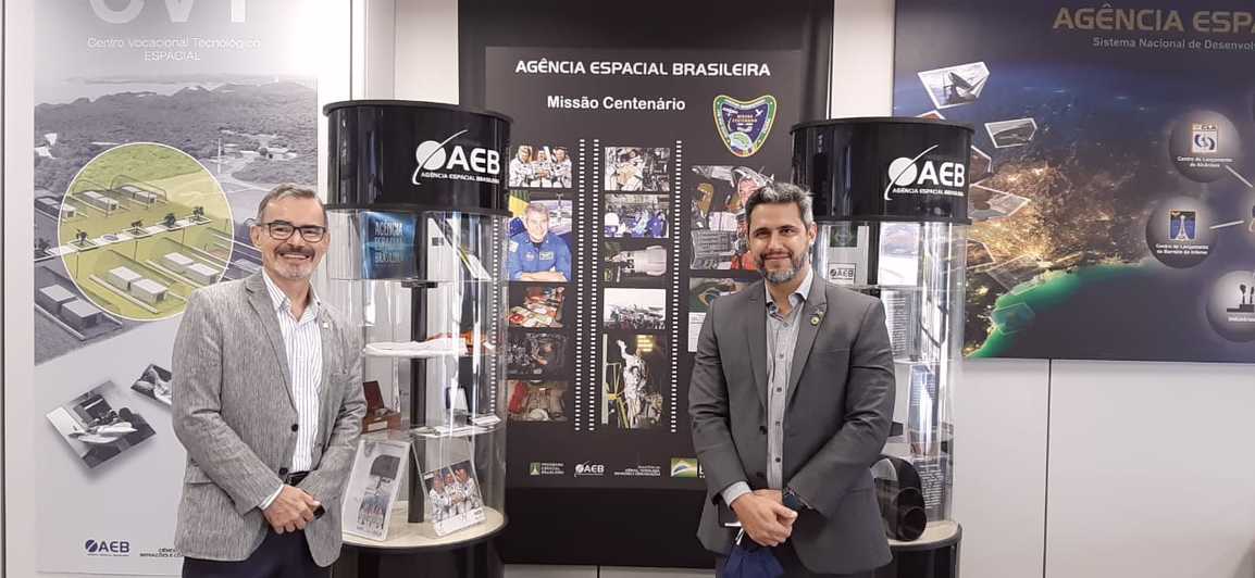 Os presidentes da Agência Nacional de Telecomunicações (Anatel), Leonardo de Morais (dir.), e da Agência Espacial Brasileira (AEB), Carlos Moura (esq.), participaram do evento “Diálogos AEB – Anatel”, realizado nesta terça-feira (10/6), na sede da AEB, em Brasília (DF).