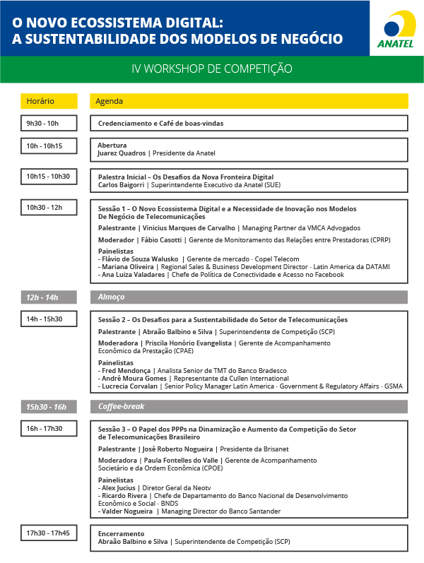 O presidente da Anatel, Juarez Quadros; o superintendente Executivo, Carlos Baigorri; e o Superintendente de Competição, Abraão Balbino e Silva, participarão do evento, além de representantes da VMCA Advogados; da Copel Telecom; da DATAMI; do Facebook; da TMT do Banco Bradesco; da Cullen International; da GSMA para Brasil; da Brisanet; da Neotv; do BNDES; e do Banco Santander.