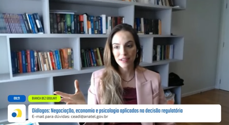 No dia 13 de dezembro, o Centro de Altos Estudos em Comunicações Digitais e Inovações Tecnológicas (Ceadi) realizou a palestra "Negociação, economia e psicologia aplicados na decisão regulatória". A apresentação foi conduzida por Bianca Bez Goulart, doutora e mestre em Direito pela UFSC, professora, advogada, presidente da Comissão de Análise Econômica do Direito da OAB/SC e integrante de associações voltadas ao direito e à sustentabilidade.