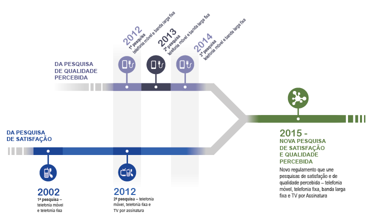 Em 2015, foi aprovado um regulamento específico para se medir simultaneamente a satisfação e a qualidade dos serviços de telecomunicações (Resolução nº 654/2015 da Anatel, que aprova o Regulamento das Condições de Aferição do Grau de Satisfação e da Qualidade Percebida junto ao Usuários de Serviços de Telecomunicações). O objetivo é unificar a avaliação desses serviços. A pesquisa de satisfação e qualidade percebida de 2015 avaliou: telefonia móvel (pré e pós pago), banda larga fixa, telefonia fixa e TV por assinatura.
