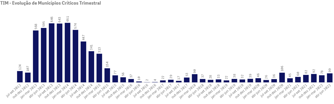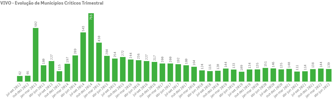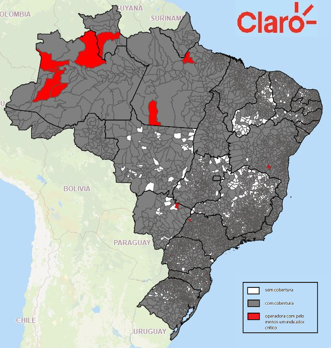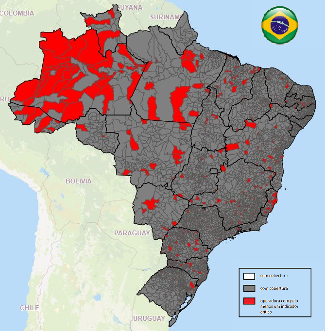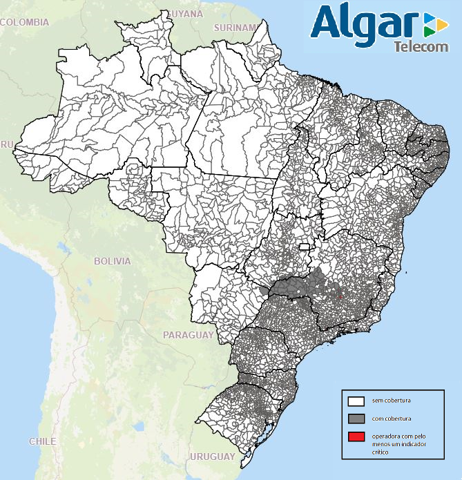 Foram apresentados, em seguida, os resultados apurados ao longo desse acompanhamento, por operadora, assim como os municípios identificados no mapa que apresentaram criticidade na última apuração realizada. Um município era considerado crítico quando algum dos indicadores avaliados ficou, em consolidação trimestral, abaixo de 85% no indicador de acesso (voz ou dados - 2G, 3G ou 4G) ou acima de 5% no indicador de queda de conexão (voz ou dados - 2G, 3G ou 4G).