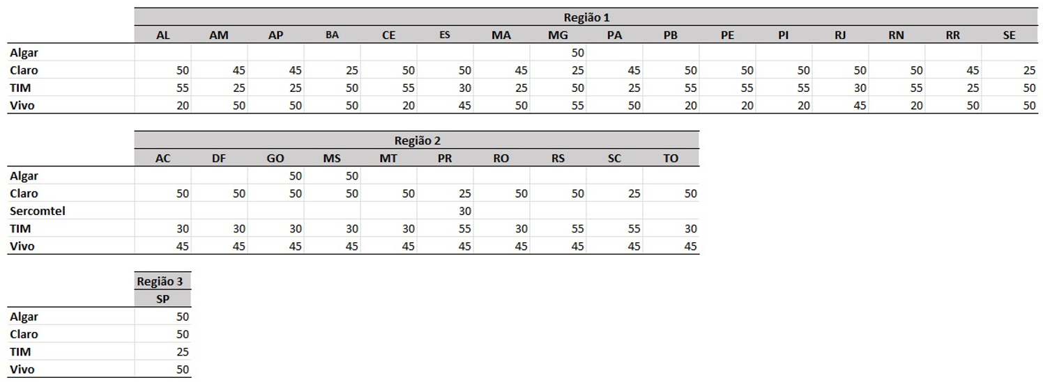 As tabelas abaixo indicam o somatório das larguras de faixa (MHz) autorizadas para as prestadoras do Serviço Móvel Pessoal (SMP), por unidade da federação. Para sistemas Frequency Division Duplex (FDD) são somadas as faixas de Downlink e Uplink: