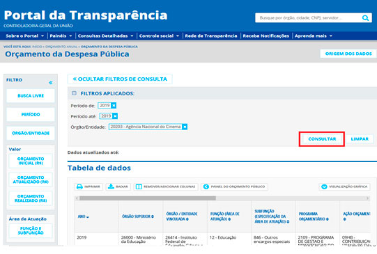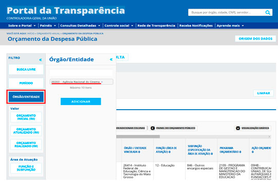 Utilizar a barra lateral esquerda de filtros para adicionar um filtro de Órgão/Entidade. Recomendamos utilizar o código de Órgão Superior do SIAFI da ANCINE, número 20203: