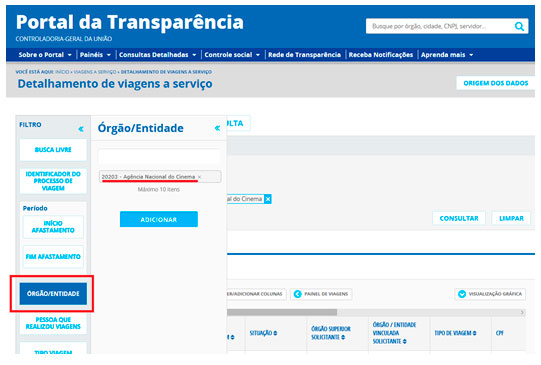 Utilizar a barra lateral esquerda de filtros para adicionar um filtro de Órgão/Entidade. Recomendamos utilizar o código de Órgão Superior do SIAFI da ANCINE, número 20203: