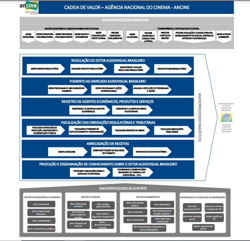 Na cadeia de valor desenhada para a Agência, vemos os macroprocessos de suporte fornecendo as condições para a realização dos macroprocessos finalísticos, que por sua vez, são afetados por um conjunto de macroprocessos gerencias. Esse encadeamento de processos tem como principais entregas para a sociedade o desenvolvimento do setor audiovisual brasileiro e o acesso ao conteúdo audiovisual brasileiro.