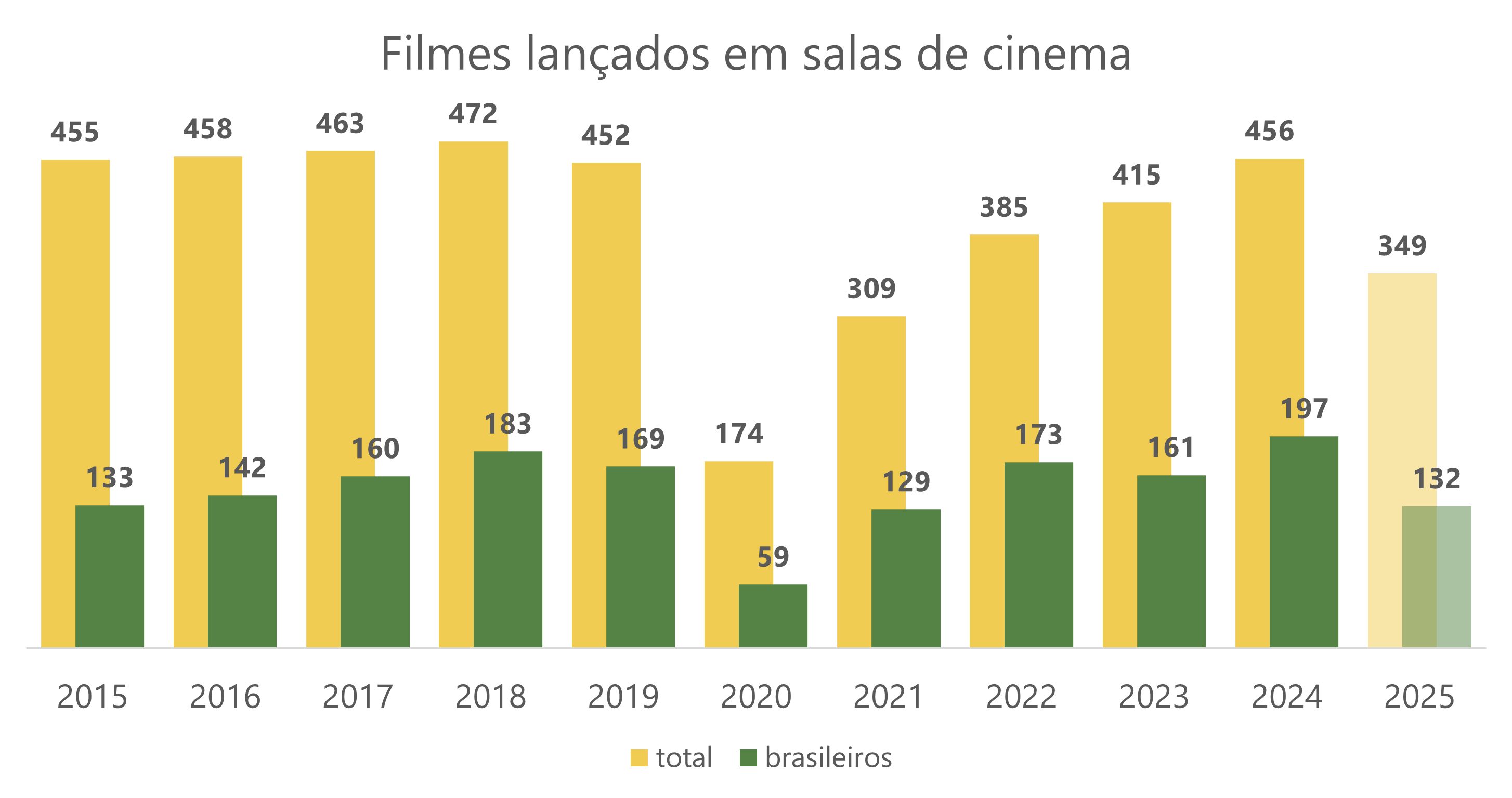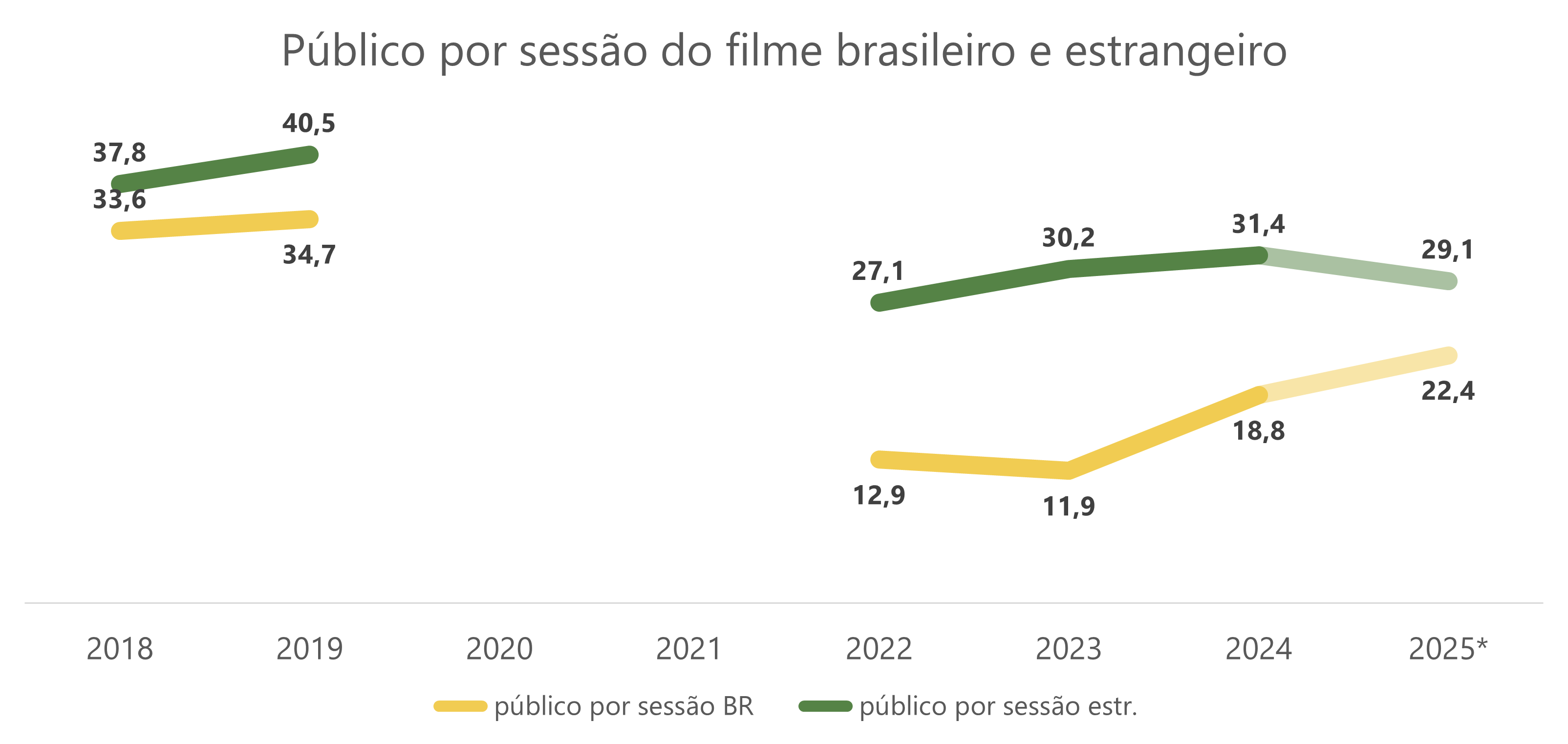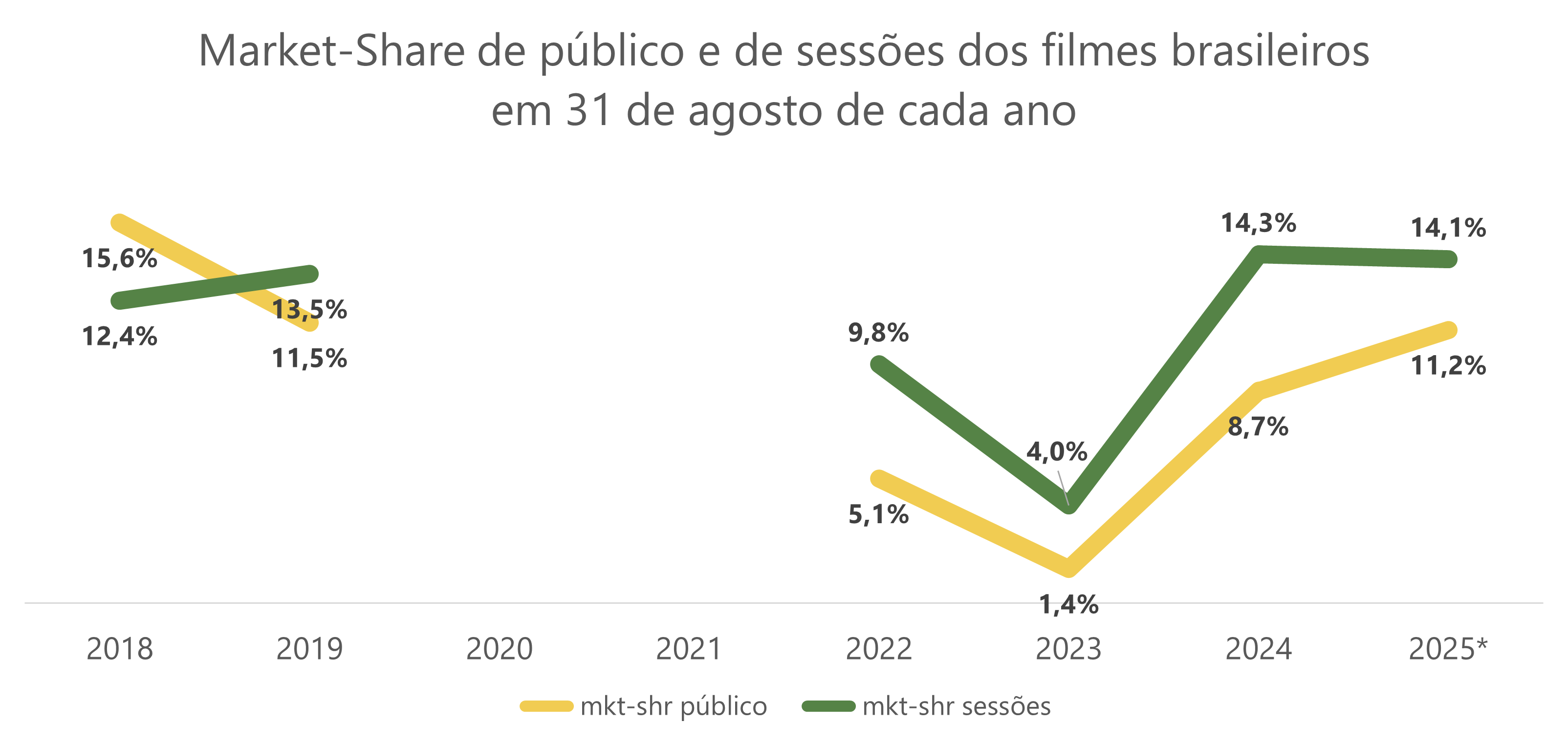 Entretanto, no que se refere ao público, 2025 apresenta uma retração de espectadores em relação ao ano de 2024. A demanda ainda revela um cenário de desafios e dificuldades para o mercado de salas de cinema. No entanto, a boa notícia é o market share (mk-sh) dos filmes brasileiros, que mantém uma rota de crescimento desde 2023, inclusive mais consistente que a dos filmes estrangeiros. Os números e dados confirmam os efeitos positivos da retomada da Cota de Tela, com o aumento das sessões e do público dos filmes brasileiros.
