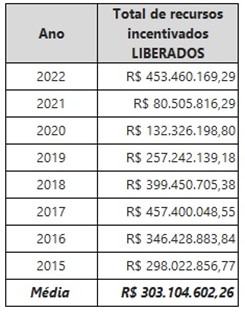 Liberação de recursos incentivados em 2022 retoma série histórica