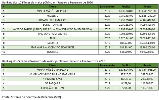 O mercado de salas de exibição brasileiro alcançou resultados expressivos no início de 2020, segundo dados do Sistema de Controle de Bilheteria da ANCINE. Considerando os dois primeiros meses do ano, o público das salas de cinema do país superou os 30 milhões de pagantes, com arrecadação de mais de 500 milhões em bilheteria. Tais valores são superiores em aproximadamente 17% e 23%, respectivamente, em relação ao mesmo período de 2019.