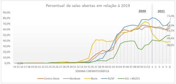 É importante mencionar que a reabertura de salas não ocorre de forma homogênea nas diferentes regiões do país. Enquanto os estados do Rio de Janeiro e São Paulo registraram na semana 6 cerca de 70% de salas em funcionamento quando comparado com o mesmo período de 2020, em outras regiões como Nordeste e Centro-Oeste esse percentual é pouco superior a 60%, e no conjunto de estados da região Sul, Minas Gerais e Espírito Santo, chega próximo de 50%. Destaque para a forte queda apresentada na região Norte, que inicia o ano de 2021 com menos de 40% de salas em funcionamento. No fim de 2020, havia cerca de 70% de salas em funcionamento.
