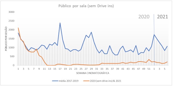 Nas seis primeiras semanas cinematográficas do ano (7 de janeiro a 17 de fevereiro) o público total ficou abaixo de 2 milhões de pagantes, com uma renda acumulada de aproximadamente R$ 30 milhões. Em 2020, neste mesmo período, considerado relevante em função das férias escolares e da concentração de grandes lançamentos, as primeiras seis semanas levaram mais de 27 milhões de espectadores às salas de cinema, com uma receita de mais de R$ 400 milhões.