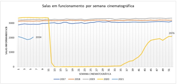 O número de salas de cinema em funcionamento, de acordo com o Sistema de Controle de Bilheteria da ANCINE (SCB), vem apresentando uma trajetória relativamente estável desde meados de novembro de 2020, com um pico nas últimas semanas de 2020, quando 2087 salas registraram atividade. Após uma queda nas primeiras semanas do ano, o total de salas abertas voltou a apresentar pequeno crescimento na sexta semana de 2021, de 11 a 17 de fevereiro, com 2034 salas em atividade. Vale dizer que, em 2020, o SCB registrou 3373 salas abertas na mesma semana. No total, o número de salas em funcionamento na sexta semana cinematográfica de 2021 foi de 60% da mesma semana em 2020.