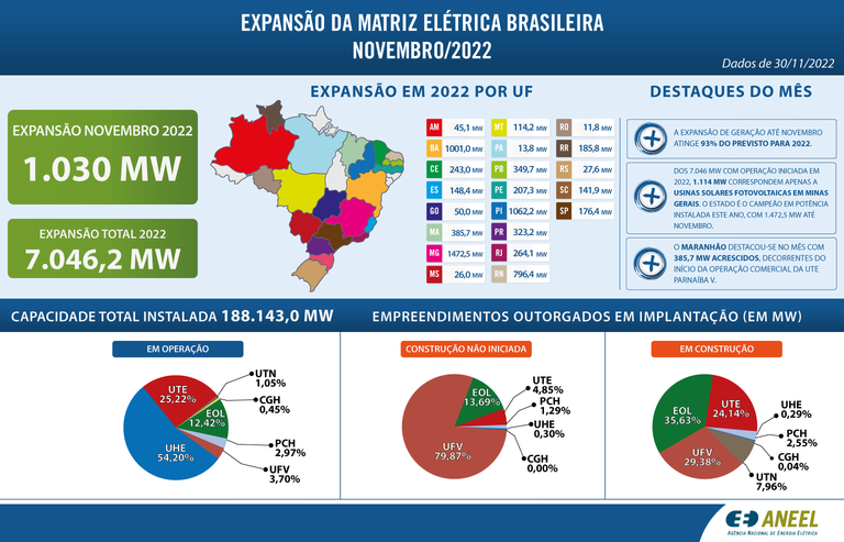 Com a liberação de 31 usinas para operação comercial, o Brasil obteve em novembro a segunda maior ampliação na capacidade instalada no ano: foram 1.030 megawatts (MW), segundo levantamento da Agência Nacional de Energia Elétrica – ANEEL. A expansão verificada em 2022, até 30 de novembro, foi de 7.046,2 MW. Esse total perfaz 93% do 7.625,1 MW previstos pela ANEEL para o ano.