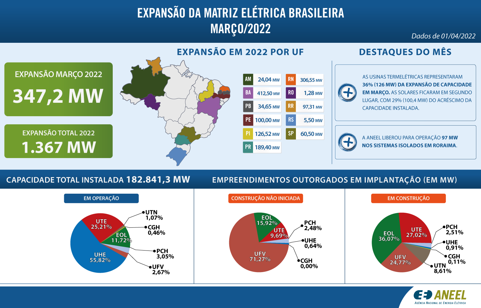 No primeiro trimestre de 2022, o aumento na capacidade instalada foi de 1.367 MW, com novos empreendimentos em 11 estados de quatro regiões brasileiras. Destacaram-se, em ordem decrescente, a Bahia, com 421,5 MW; o Rio Grande do Norte, com 306,6 MW; e o Paraná, com 189,4 MW. O estado de Roraima, atendido por sistemas isolados, recebeu em março um acréscimo de 97 MW em termelétricas.