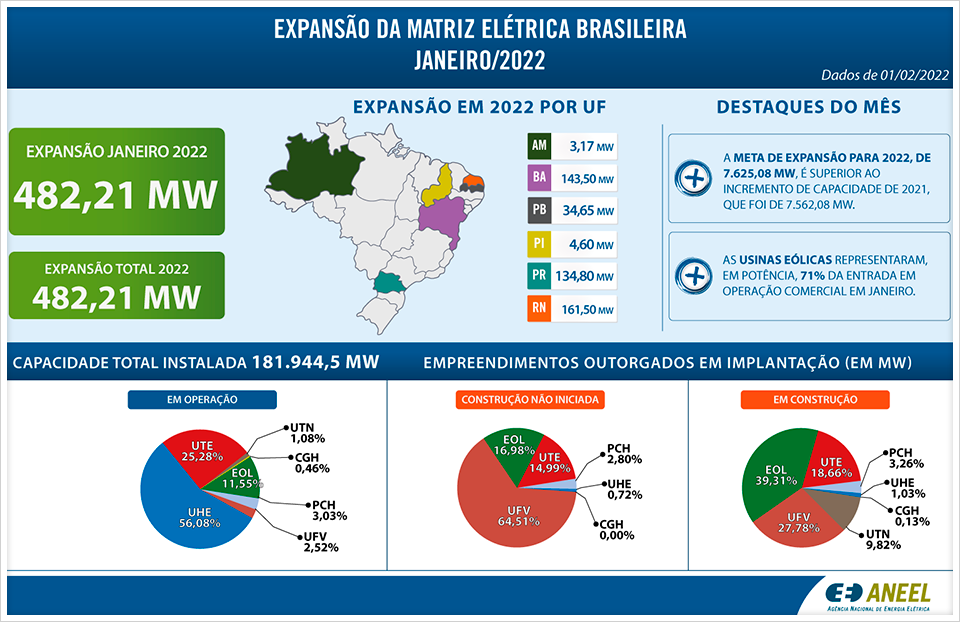 O Brasil inicia 2022 com 181.944,5 MW de potência fiscalizada, de acordo com dados do
