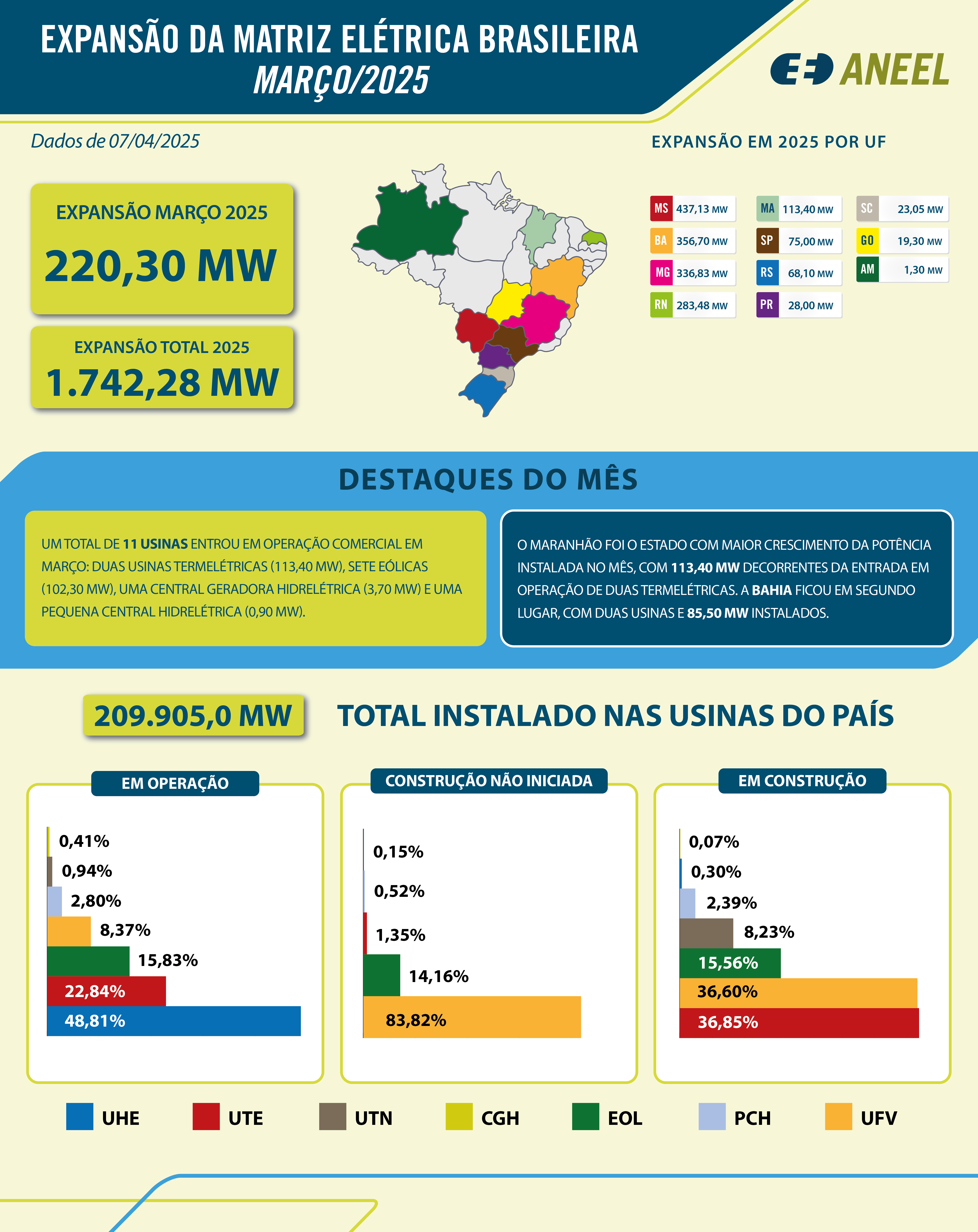 O primeiro trimestre do ano contou com a liberação de novas usinas em 11 estados nas cinco regiões do país. O Mato Grosso do Sul apresenta a maior expansão no período, com 437,13 MW, seguido da Bahia, com 356,70 MW. Considerando apenas o mês de março, o Maranhão foi o estado com maior crescimento da potência instalada no mês, com 113,40 MW decorrentes da entrada em operação de duas termelétricas. A Bahia ficou em segundo lugar, com duas usinas e 85,50 MW instalados.