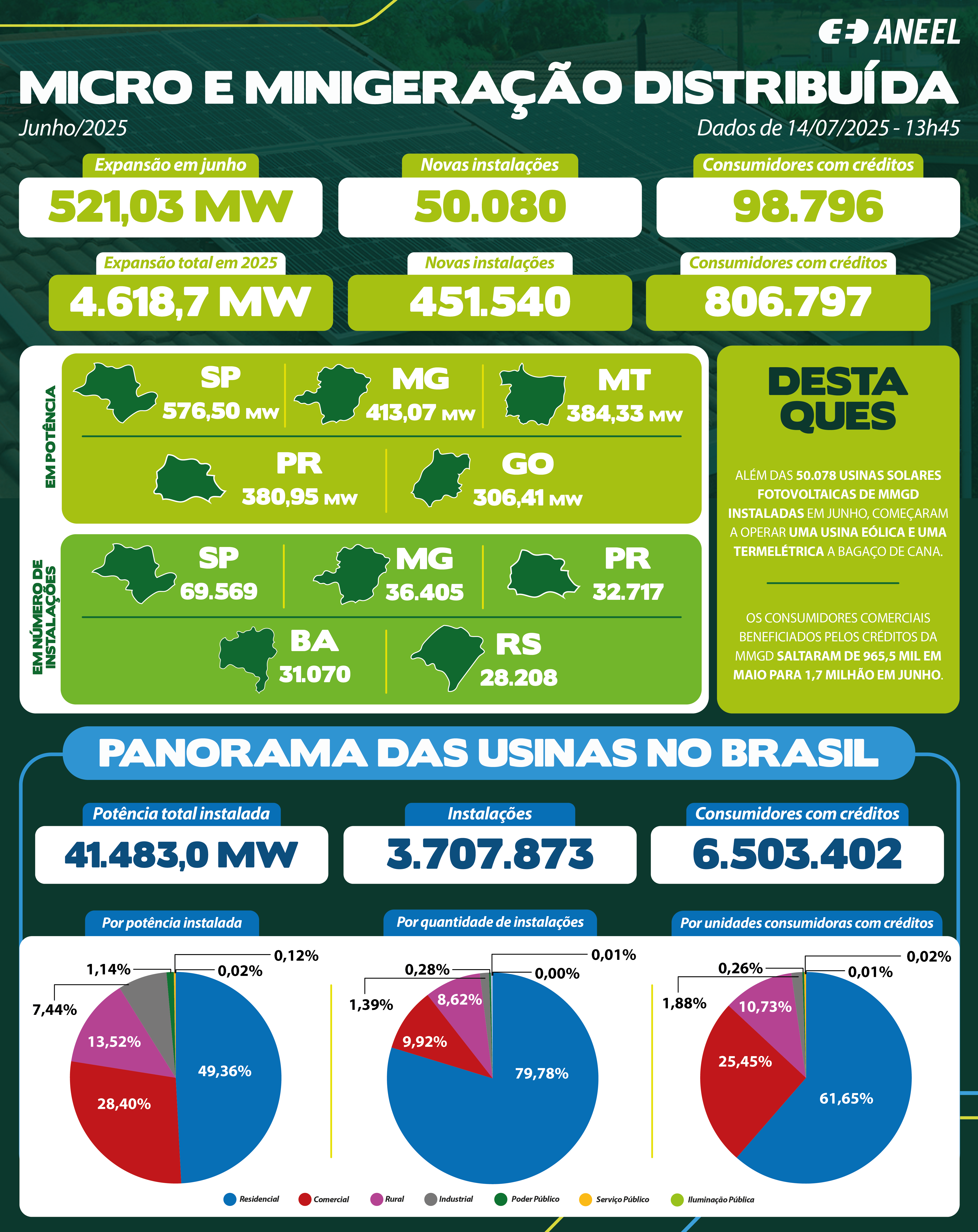Em junho, foram instalados mais de 50 mil sistemas de MMGD, reunindo uma potência de 521,03 megawatts (MW). Começaram a funcionar no mês 50.078 usinas solares fotovoltaicas, uma usina eólica e uma termelétrica movida a bagaço de cana.