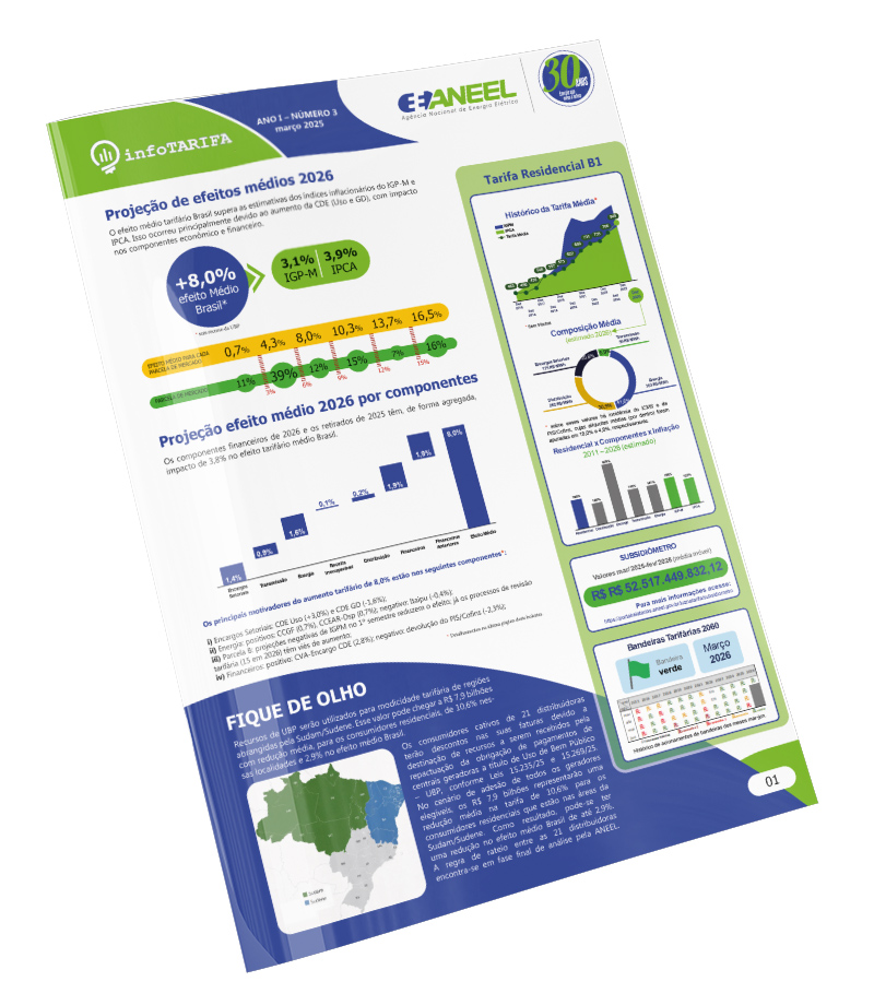 Em abril de 2025, a ANEEL lançou o InfoTarifa, que mostra estimativa de variação tarifária anual. Com publicação trimestral, o boletim detalha a evolução histórica e os principais impactos em cada componente das tarifas, além de apresentar o panorama dos processos em andamento e de fatores que influenciam nos cálculos realizados pela Agência, como os encargos setoriais.